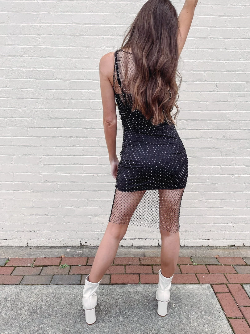 – Two pieces – black dress with adjustable straps and rhinestone fishnet piece that goes over the black dress