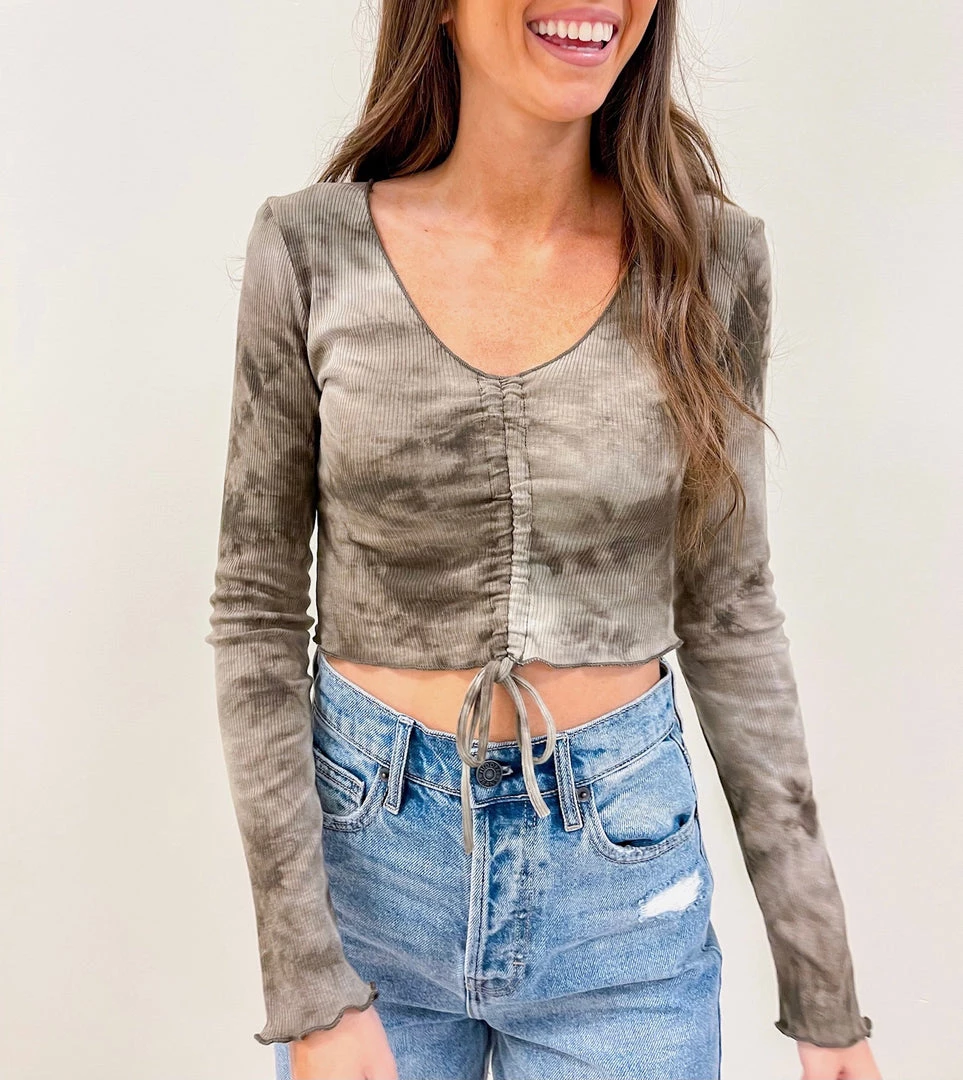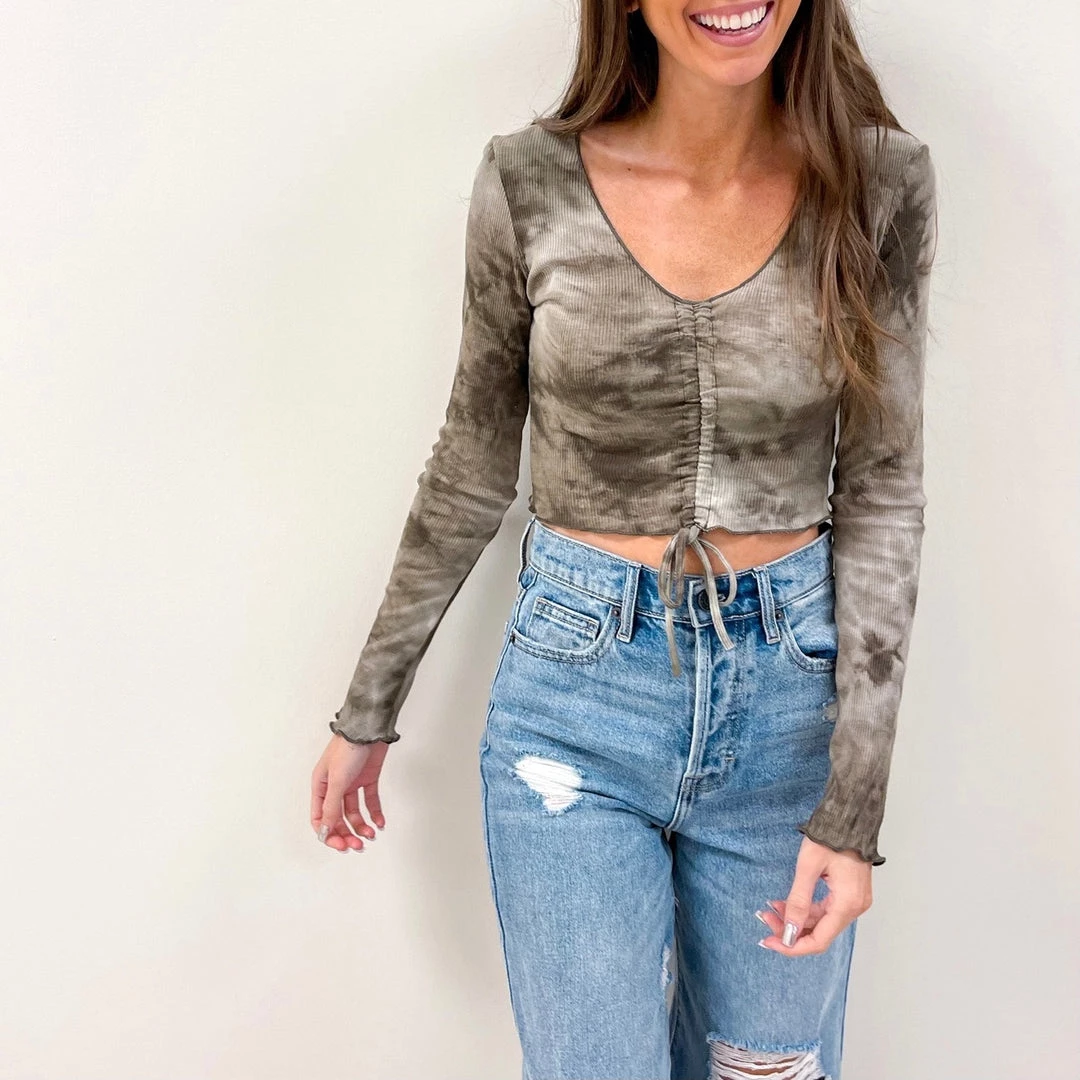 – Ties along the center can be scrunched up for a more cropped fitÂ