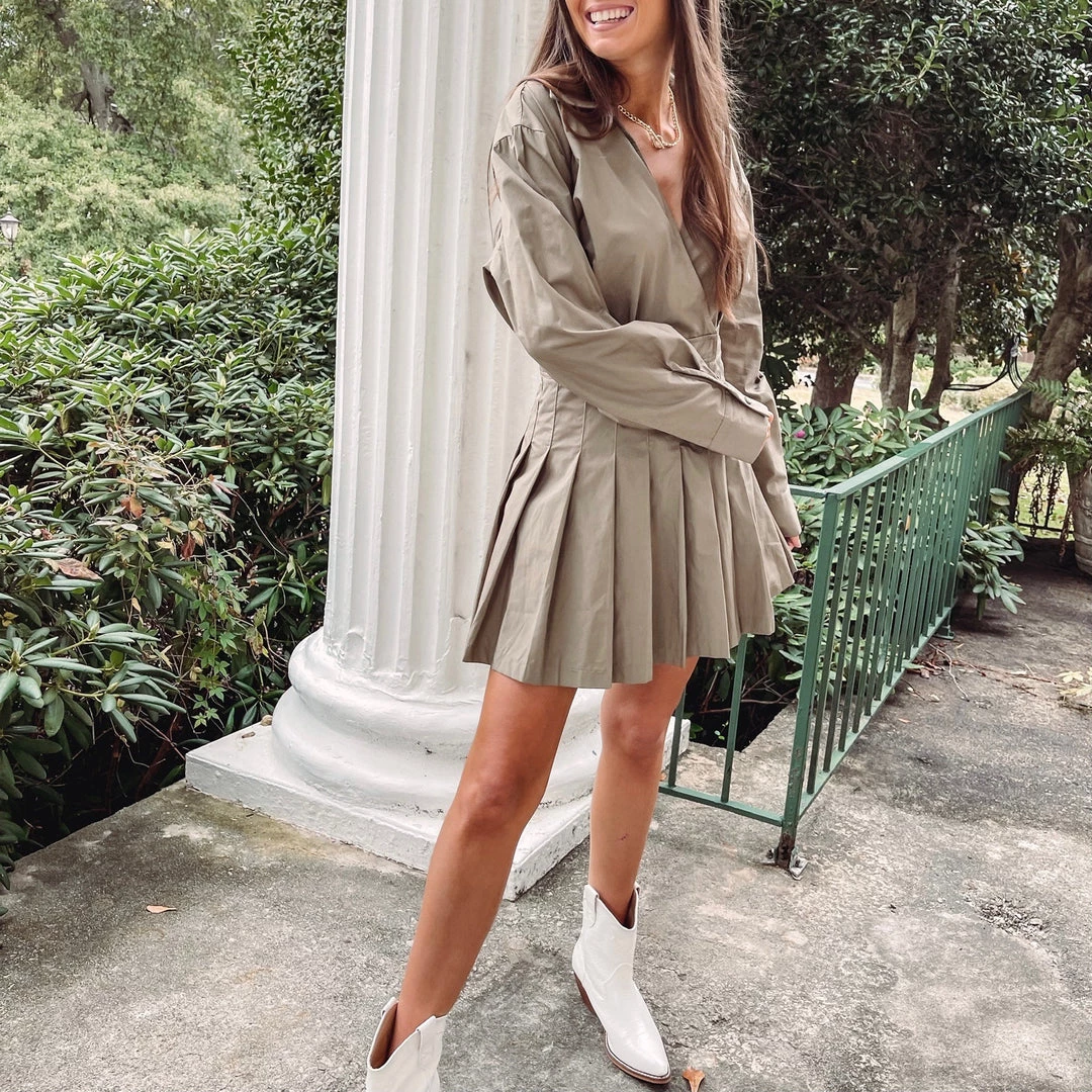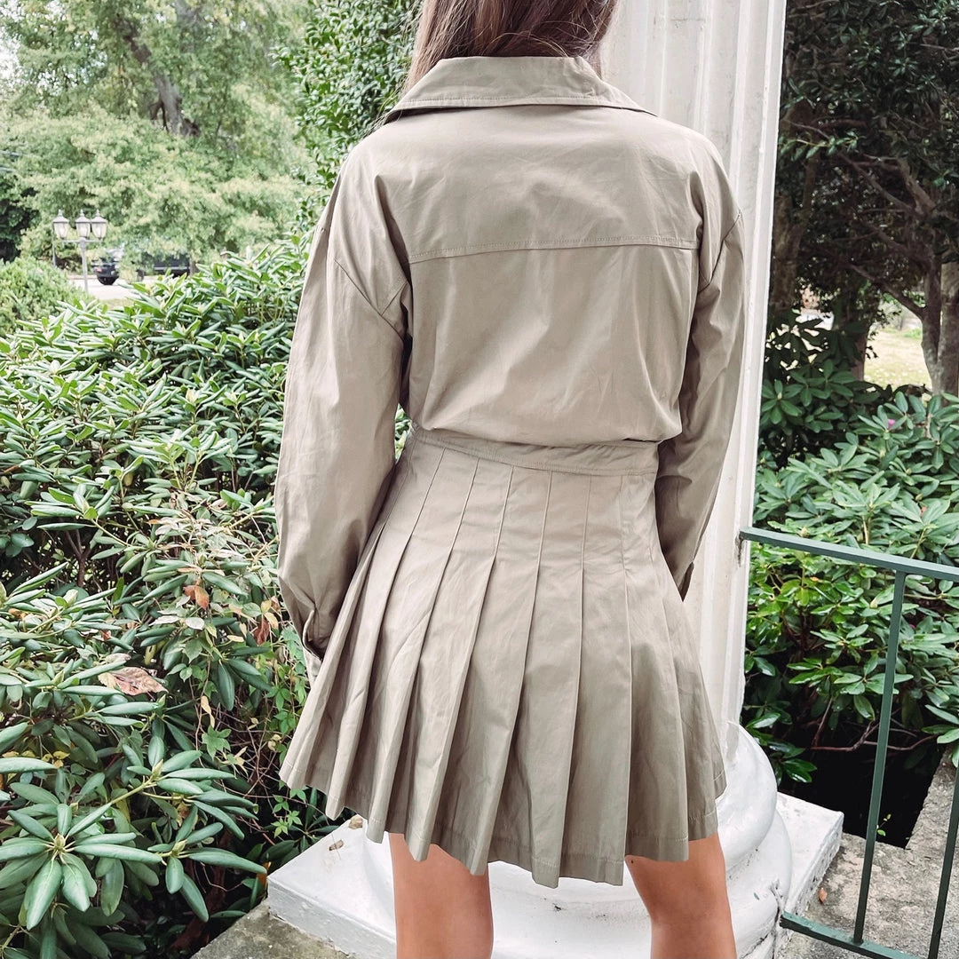 – Pleated skirt, wrap button closureÂ