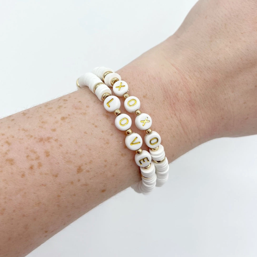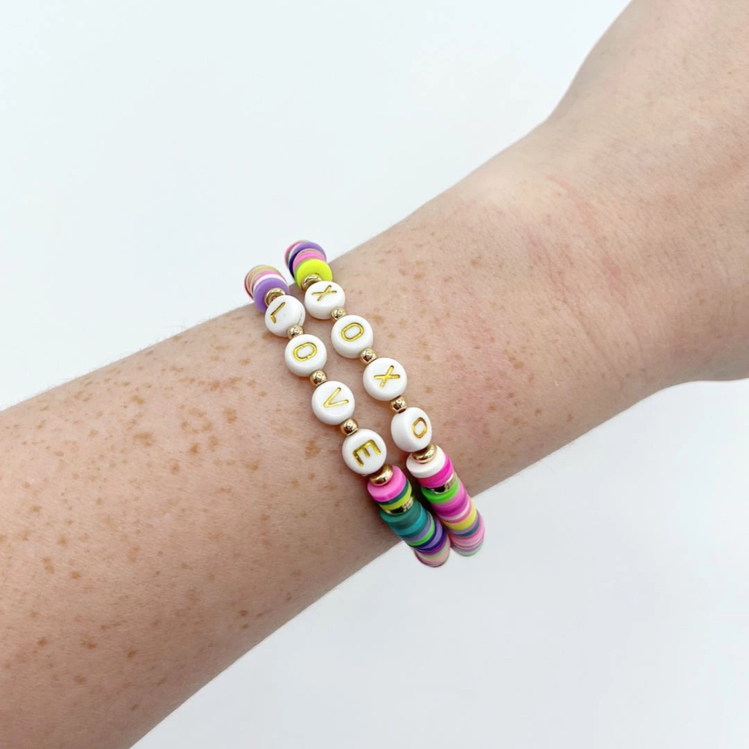 – Set of two bracelets: One with “Love” beads, One with “XOXO” beads
